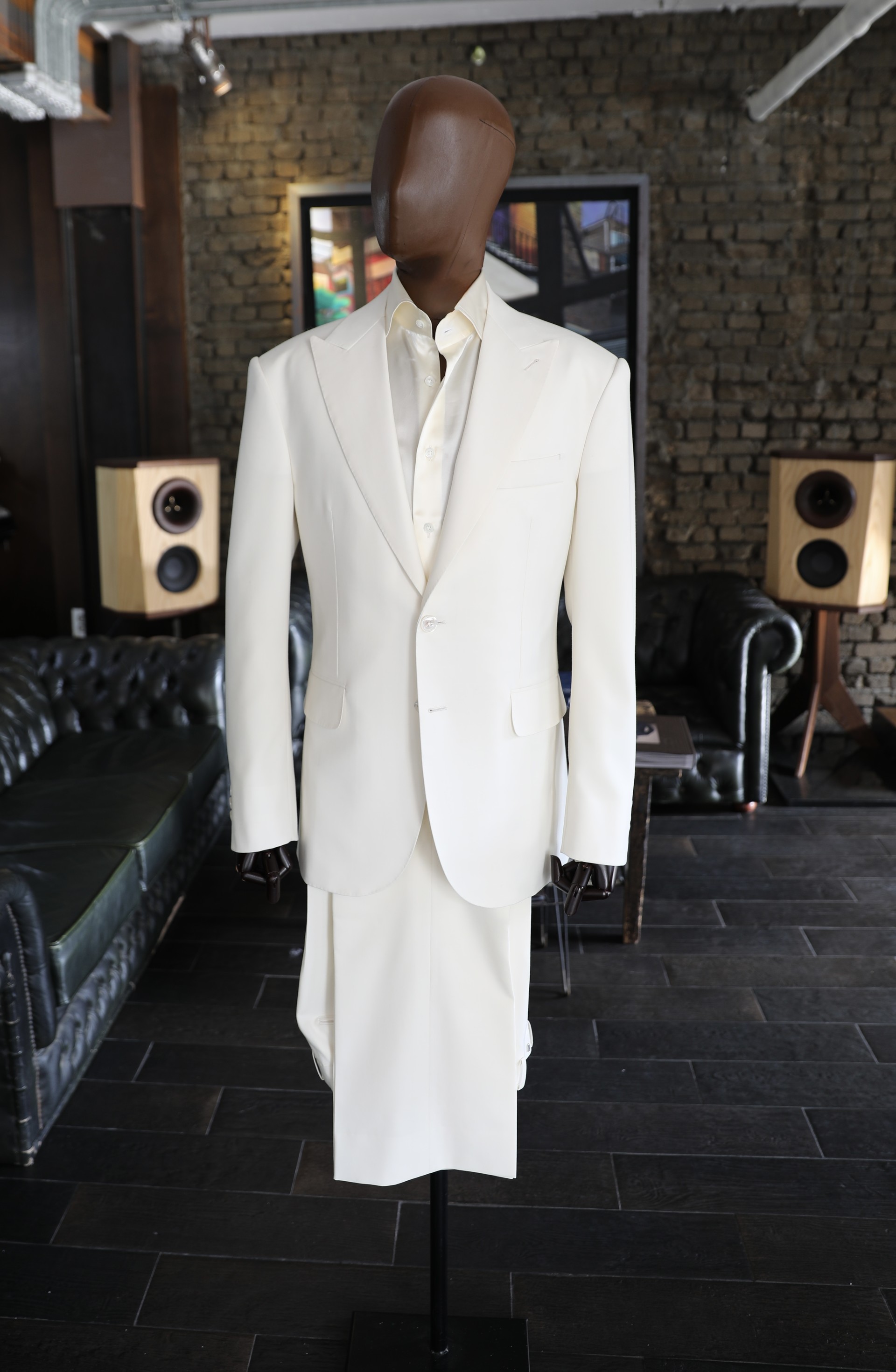 A deep burgundy suit and an ivory counterpart.